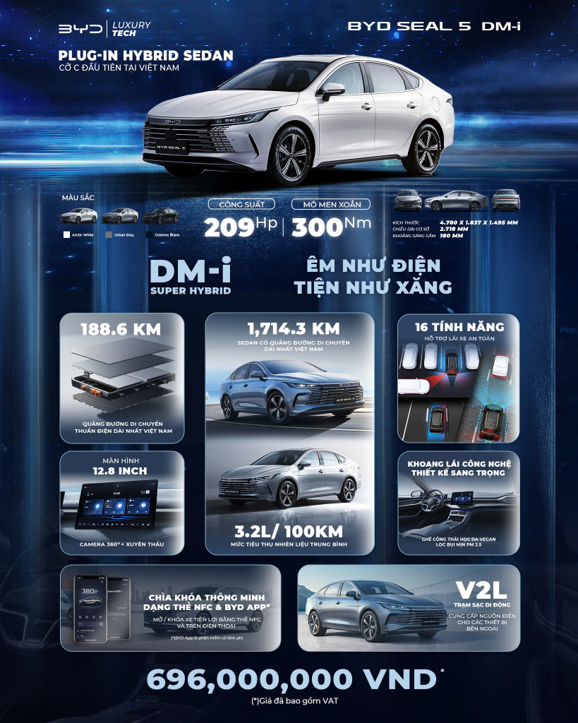 Cập nhật giá của Seal 5 – BYD Seal 5 chính thức ra mắt tại Việt Nam, thiết kế Ocean Series, công nghệ DM-i Super Hybrid, giá chỉ từ 696 triệu đồng.